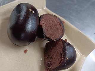 「粒餡で、昔からのお店でね。白と茶色の皮がセットのヘソ饅頭!餡こがぎっしりなんです、食べて下さい〜」 |