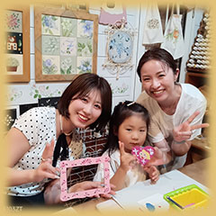 ■小さなボク達がいらっしゃるママが、子供達をパパに預けて参加です。「ずーっとやってみたかったの。家の近くにある教室からチラシをもらっていて、まだ子供が小さいから私にはとうぶん無理だなぁって思いながら、そのチラシをずっと取っておいてため息をついてばかりいたんです・・・」とのこと。まぁ、そうなれば今日は、ずーっとやってみたかったコトをご一緒しましょう。ママは大きなファミリーネームプラークを作ることになりました。『やってみたかったの』がとっても伝わって来ます。ステキなあピンクとママの手から生まれ出て来たご家族の名前の並ぶプレートは、とっても光って見えました。