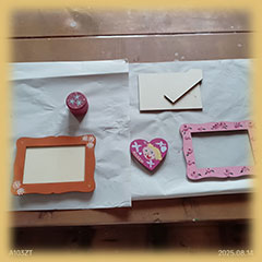 さあ、今日はどんなのをやりましょうか。いつの間にか、白木もすっかり決めていたようです。パパもいつも必ず参加してくださっているのです。私は、手桶、パパは「家の表札が気になっていて・・、。」と、いうことで大き目のプラークです。さてさて、始めましょう。今回お留守番のお兄ちゃんとママにも自慢出来るのをつくりましょうね。今、ファーストトレインで秘かにブームになっているステンシルプレートを使ってみました。そっと、剥がすときのワクワク感がたまりません。見てください。パパと2人の旅の、素敵な作品が出来ました。いつか今まで作った作品もズラリと並べて写真を撮らせてね。ええ、今度はお兄ちゃんもママもご一緒にね!!