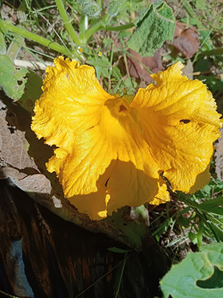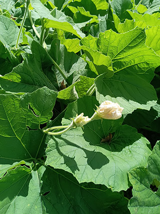 ジャガイモを掘った後の畝にドンドン蔓を伸ばしてるこの様子。 カボチャを植えたはずなのよ?! カボチャの花って黄色よね?!