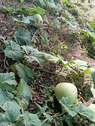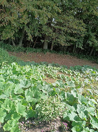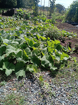 ジャガイモを掘った後の畝にドンドン蔓を伸ばしてるこの様子。 カボチャを植えたはずなのよ?! カボチャの花って黄色よね?!