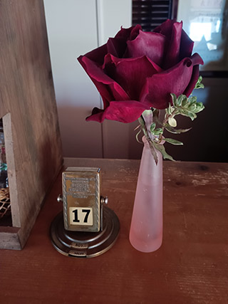 その一輪をカウンターに飾ってお迎えする本日の昭和40年会会員は先月に続いてまたまた帰って来て下さるタニガミパパです。 |