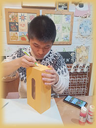 彼ははじめは、失敗しないデザイン、ということでマーブルのお花を描き上げその横には趣味でもある釣りでいつかは釣り挙げてみたいという赤い目の魚をデザインしました。彼女は大切にしている髪留め入れにするために箱を材料に選んでその髪留めの絵を描いた上に得意の書の漢字をデザインしました。