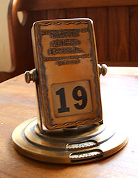 パタパタと前に倒すように半転させて日にちが変えられる万年カレンダーです。月と曜日は一番下の円形の台の部分で2重になっていてダイヤル式になっています。何とも、鈍く光る真鍮の色は私の心をくすぐります。お客様をお迎えする時に宿泊カードをご記入していただくのに活躍しています。消灯のときに次の日にちにコトリと、ゆっくり音を立てて変えるのですが半回転のつもりが嬉しくなってパタパタ、とやっては戻して「ちゃんと動いている!」と、ひとりでニマニマ笑っています。誰にも見つからないようにね!!
